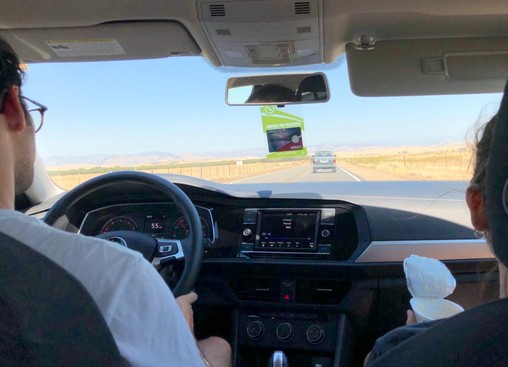 On a loué une berline, de la marque Volkswagen, pour aller à Yosemite. Moi, j’ai pris la place derrière pour accompagner mes amis sur cette étape du trip. On a dû traverser le pont San Francisco à Oakland, dit Bay Bridge, pour quitter la ville, afin de nous mener vers Yosemite. La route était très pittoresque. Plus on s’éloignait de la ville, plus le terrain devenait onduleux, d’une herbe très blanchie et asséchée par le soleil.